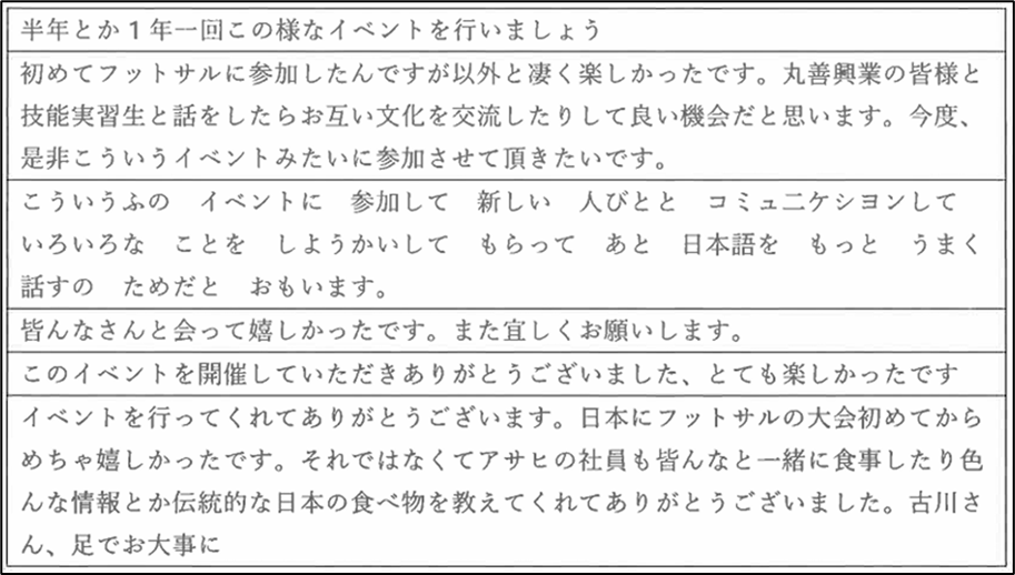 「この度はとても楽しい企画を提案・実行していただき感謝申し上げます。当日の天気にも恵まれ皆さんの違う一面をうかがえました。特にインドネシアとネパールの皆が上手でビックリしました。